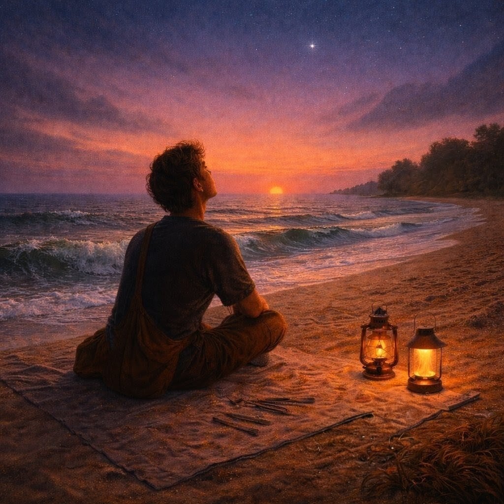 彼はランタン作りの手を止め、砂浜に寝転び目を閉じました。